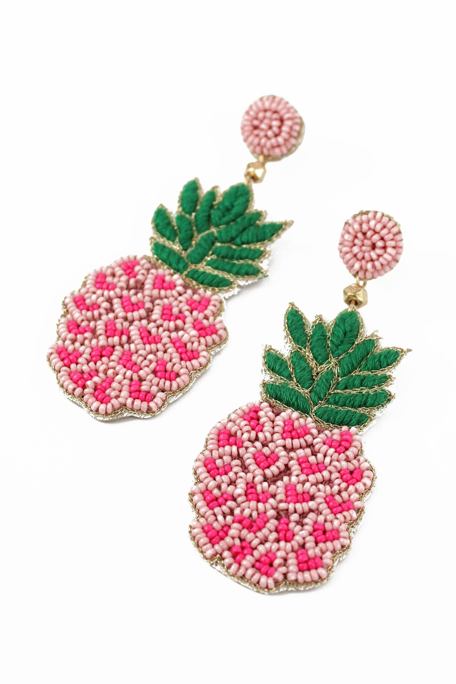 Hand-crafted pineapple earrings ft intricate heart detailing. -Handmade by artisans in India. -Approximately 55mm long with a 10mm circle top. -Made on a lightweight fabric backing.
