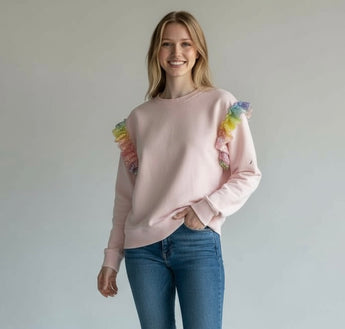 Sequin Rainbow Shoulder Ruffles Light Pink Sweat-top
