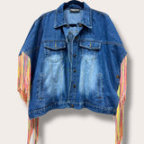 This hybrid denim jacket is a fun mix of jacket and kimono. With poppers running down the sides you can adapt the fit, and the rainbow fringe takes it to another level.