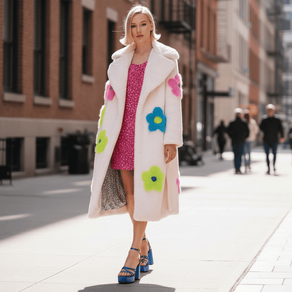 Make a winter statement in this fabulous full length coat with multicolour flower detail. When the weather is grey and cold you’ll bring the sunshine in this fabulous piece