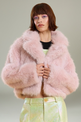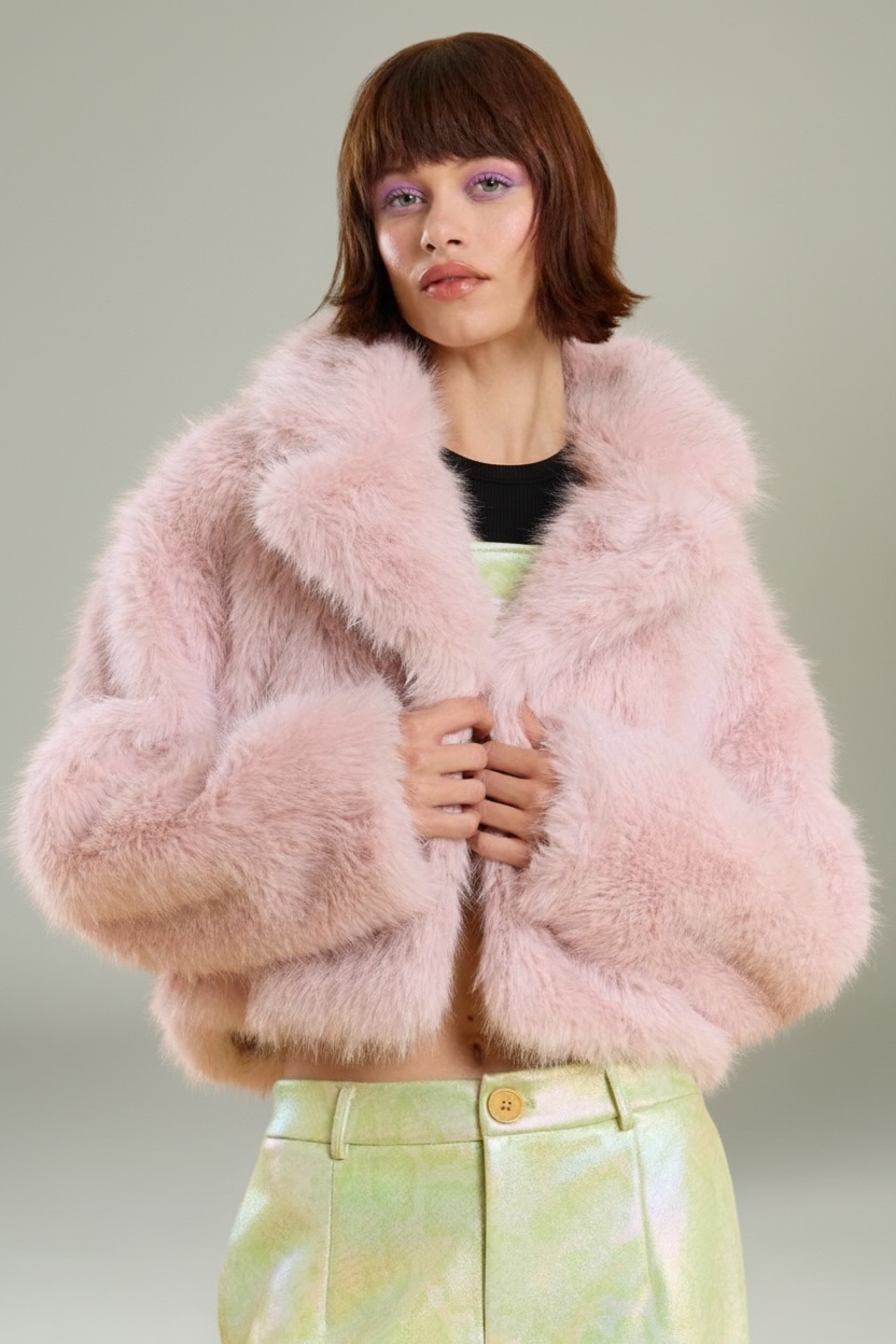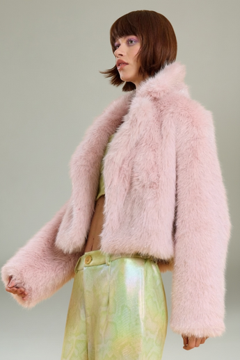 Make a sustainable style statement in this bamboo fibre Mongolian faux fur jacket is lightweight, warm and breathable. In a blush pink with beautiful silver flecks running throughout. This jacket feels like a big stylish hug.