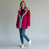 This mid length red and pink bamboo blend jacket with a turquoise trim is definitely a winter style statement.