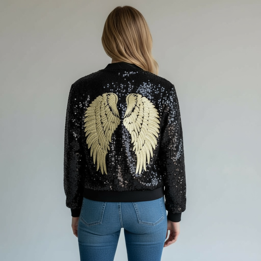 Stand out from the crowd in this sparkly black jacket embellished with a sparkling Gold Wings design. With heavy weight sequins that reverse from green to black as you stroke them, it’s a perfect piece to brighten up any outfit.