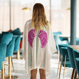 White Sequin Kimono with Pink Angel Wings Appliqué