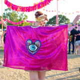 Own the moment with our handmade sequin kimono, crafted with passion and sustainability in our Devon studio. A mid length waterfall shape kimono made from lightweight hot pink sequin fabric with eye and Heart appliqué.