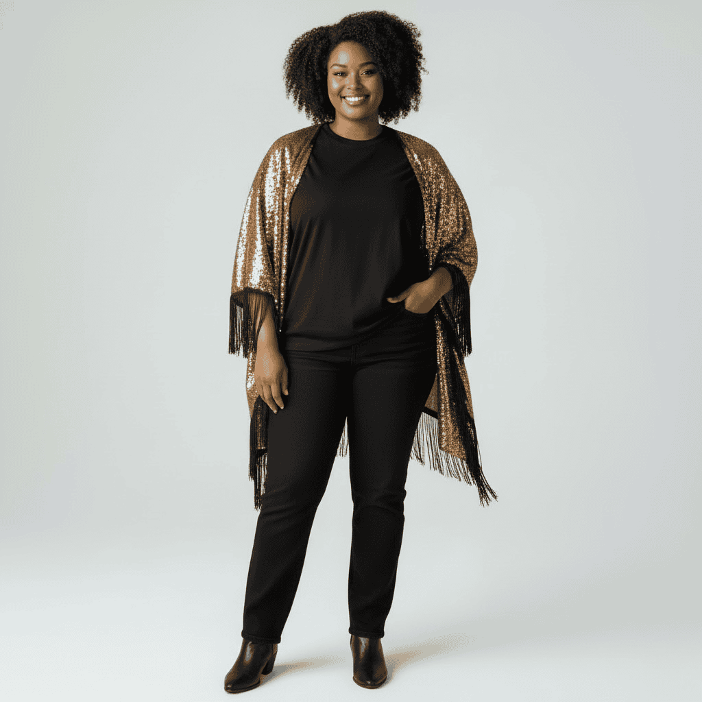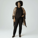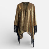 Own the moment with our handmade sequin kimono, crafted with passion and sustainability in our Devon studio. A shorter mid length waterfall shape kimono made from sparkling gold sequin fabric with black tassel fringing.