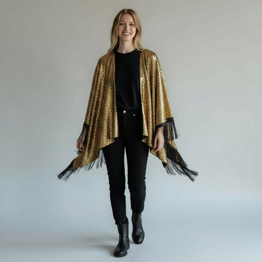 Own the moment with our handmade sequin kimono, crafted with passion and sustainability in our Devon studio. A shorter mid length waterfall shape kimono made from sparkling gold sequin fabric with black sequin tassel fringing.