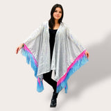 Silver Sequin Kimono with Pink and Blue Fringe