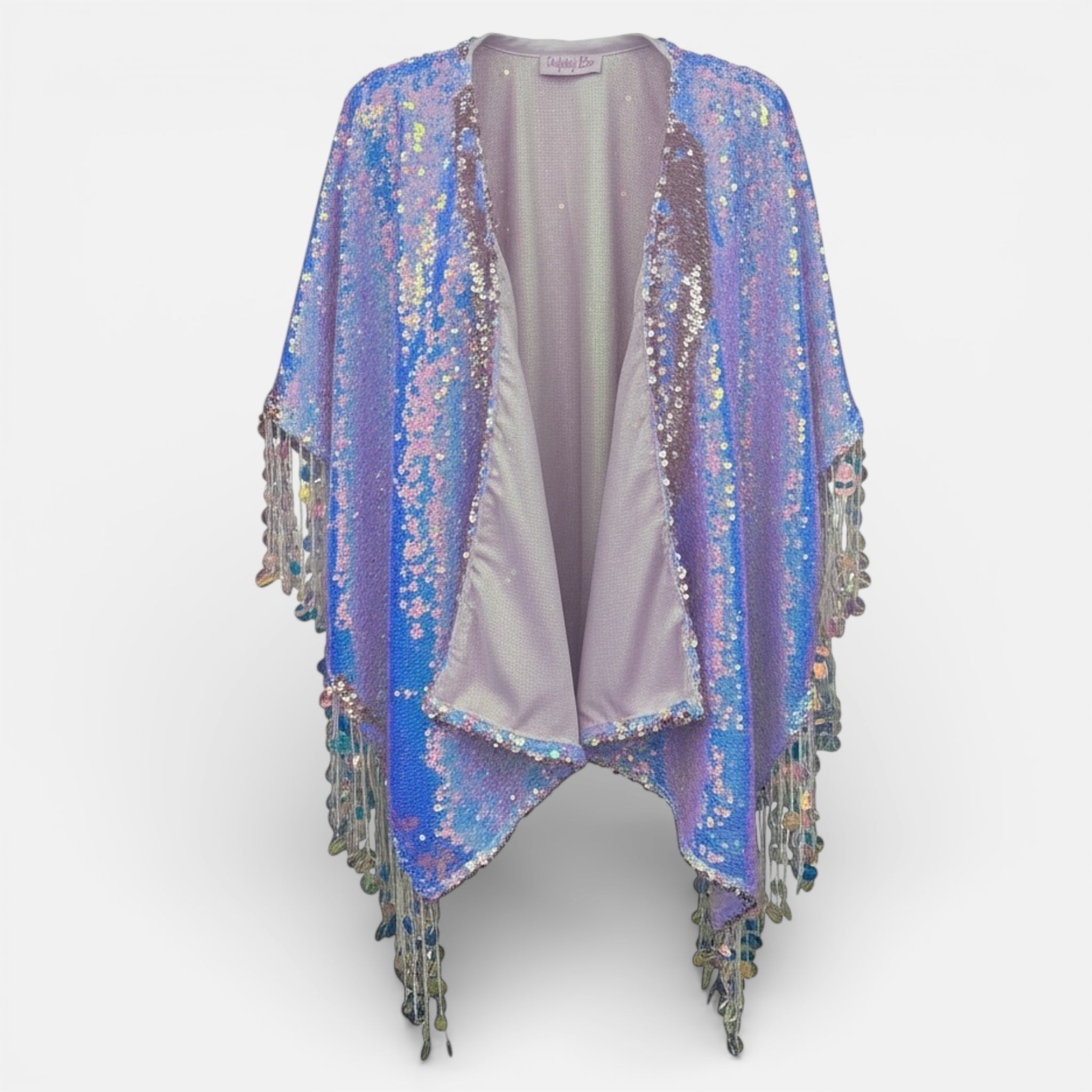 Own the moment with our handmade heavy weight sequin kimono, crafted with passion and sustainability in our Devon studio. This heavier weight iridescent white and pink sequin kimono is a statement piece. It changes colour from iridescent white to pink and has large iridescent sequin tassels running down either side. It will flatter your shape whether you're petite or plus size.