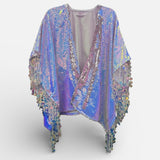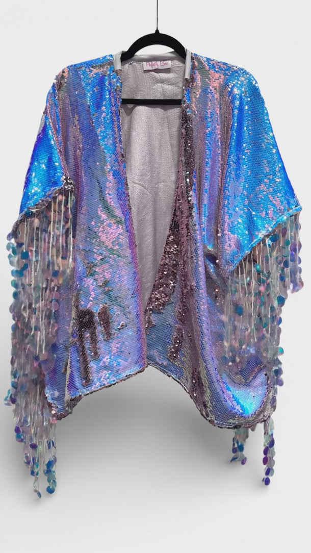 Heavyweight Sequin Kimono Iridescent White and Pink with large iridescent sequin tassels