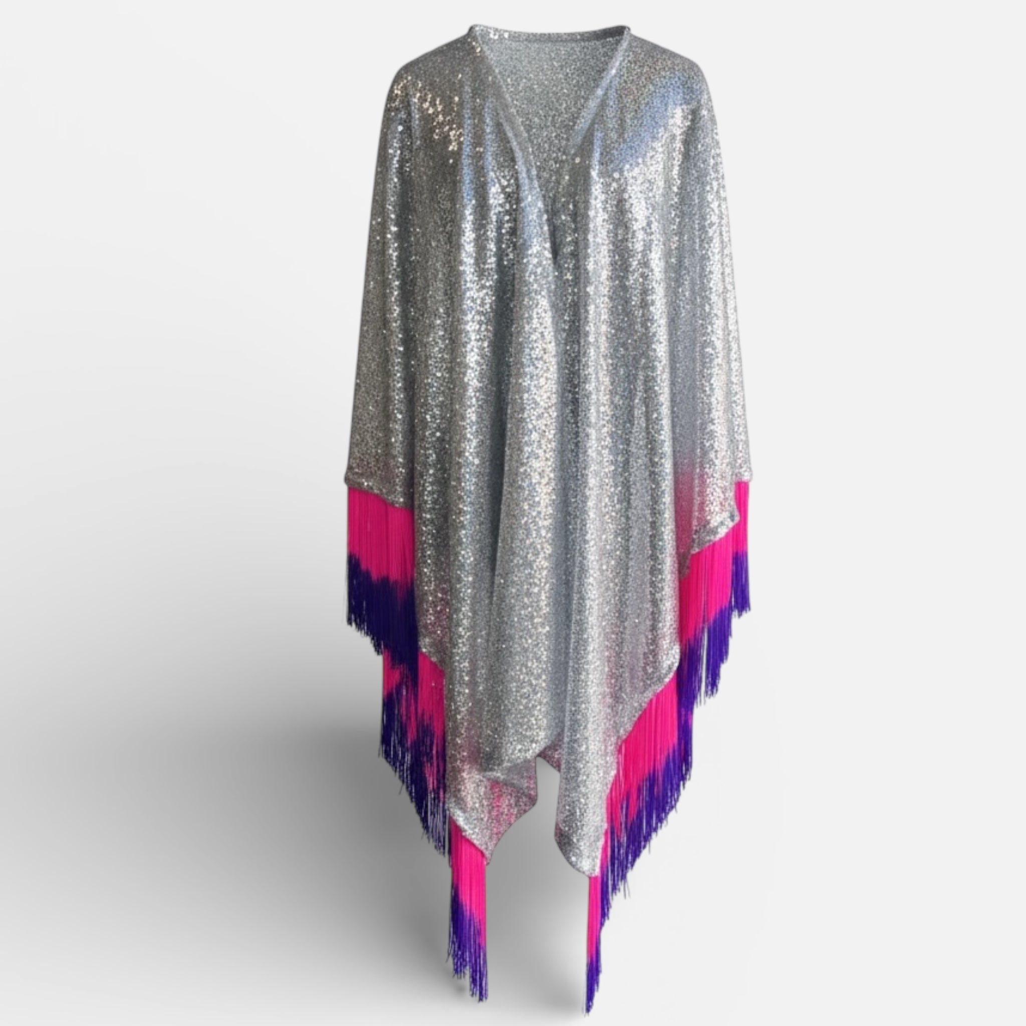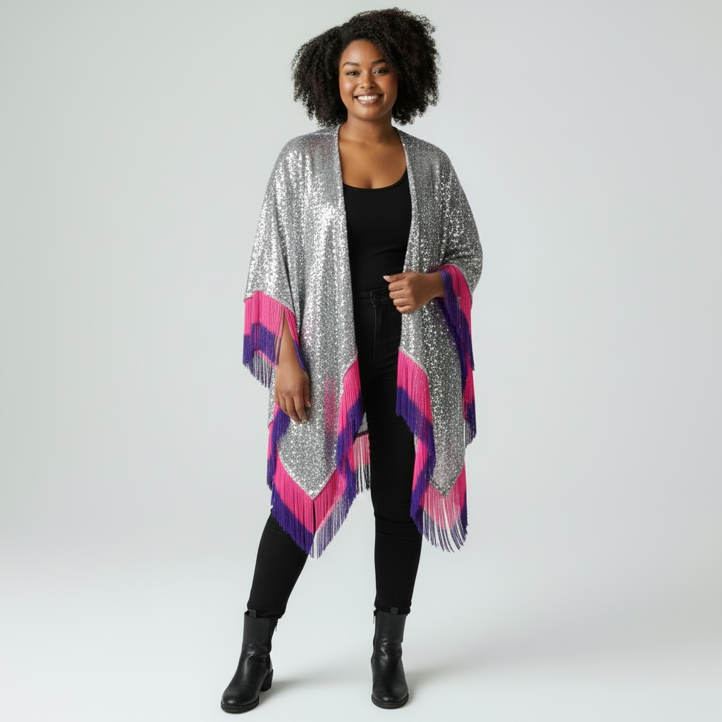 Silver Sequin Kimono with Pink and Purple Tassel Fringe