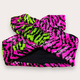 This lime green and pink zebra sequin wired Hair wrap is a bold fun piece, look fabulous at a party or stand out at a festival