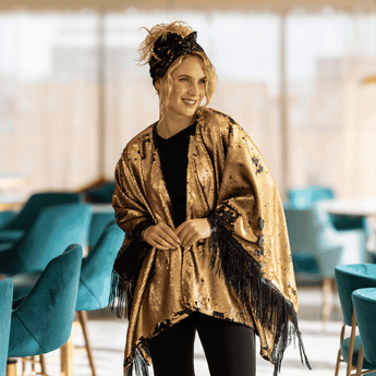 Own the moment with our handmade sequin kimono, crafted with passion and sustainability in our Devon studio. A shorter mid length waterfall shape kimono made from sparkling Gold and Black Two-Tone sequin fabric with black fringing.