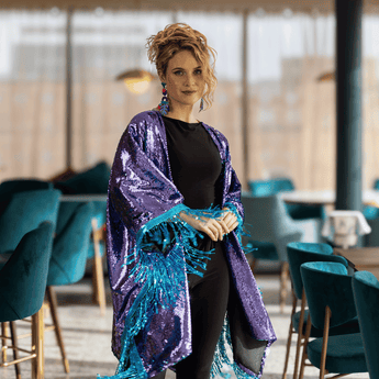 A mid length waterfall shape kimono made from sparkling purple and turquoise sequin fabric with turquoise sequin fringing