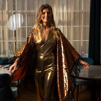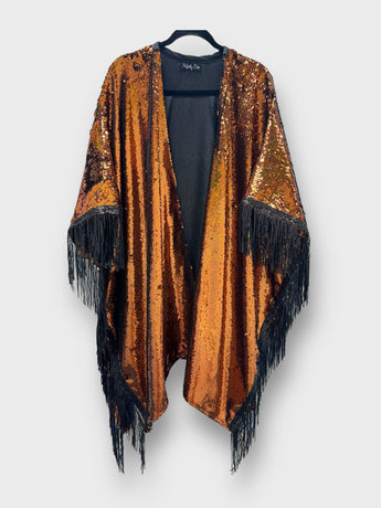 Own the moment with our handmade sequin kimono, crafted with passion and sustainability in our Devon studio. A mid length waterfall shape kimono made from sparkling copper sequin fabric with black sequin fringing.