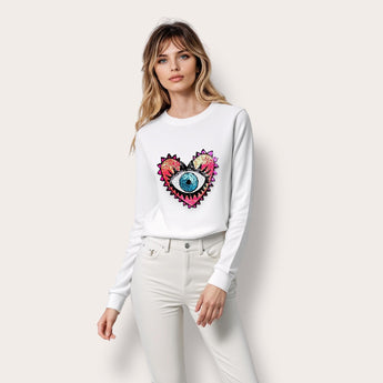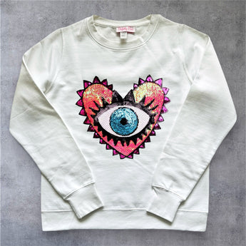 Pink Sequin Heart and Eye Embellished White Sweat-top