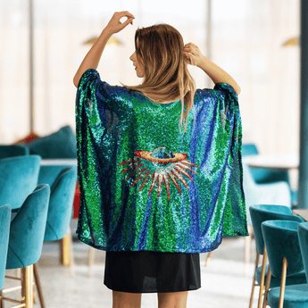 Feel out of this world in our handmade sequin kimono, crafted with passion and sustainability in our Devon studio. A mid length waterfall shape kimono made from lightweight mermaid green sequin fabric with planet appliqué.