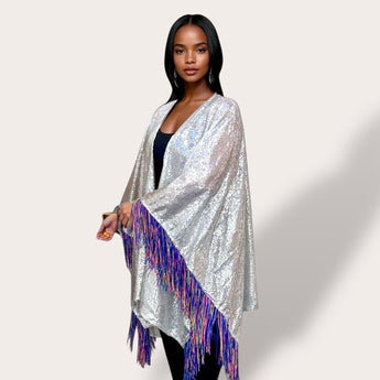 Featuring a stunning blue rainbow fringe across the sleeves, it will move every time you do, creating a blur of colour every time you walk, dance or twirl.