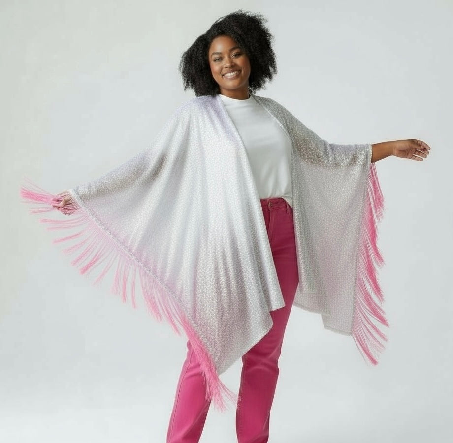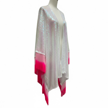 White Sequin Kimono with Ambre Pink Tassels Appliqué